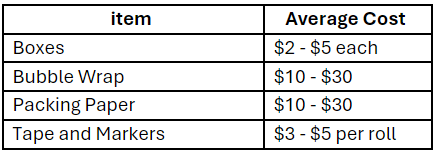 Bubble Wrap and Packing Paper: Essential for protecting fragile items. Expect to spend around $10-$30.