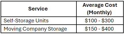 Moving Company Storage: Some moving companies offer short-term storage solutions, but these can be more expensive, averaging $150-$400 per month.